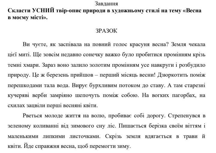 Помогите пж: Скласти УСНИЙ твір-опис природи в художньому стилі на тему «Весна в моєму місті». ЗРАЗОК Ви чуєте, як заспiвала на повний голос красуня весна? Земля чекала цієї миті. Ще зовсім недавно сонечку важко було пробитися промінням крізь темні хмари. Зараз воно залило золотим промінням усе навкруги і розбудило природу. Це ж березень прийшов - перший місяць весни! Дзюркотить поміж перешкодами тала вода. Вирує бурхливим потоком до ставу. А там старезні кучеряві верби замріяно шепочуть поміж собою. На вогких пагорбах, на схилах зацвіли першi весняні квіти. Рветься молоде життя на волю, пробиває собі дорогу. Стрепенувся в зеленому коливаннi вiд зимового сну ліс. Пишається берiзка своїм вiттям і маленькими липкими листочками. Скрізь земля вдягається в трави й квіти. Йде справжня весна, щоб перемогти зиму.