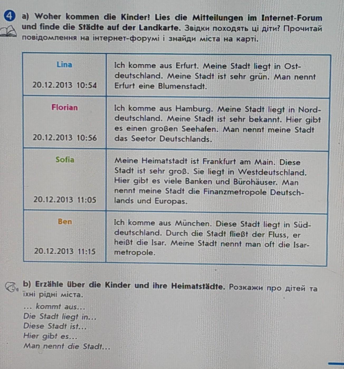 Es gibt fünf Kinder in diesem Internet-Forum, die über ihre Heimatstädte sprechen. Lina kommt aus Erfurt, das in Ostdeutschland liegt und bekannt als die "Blumenstadt" ist. Florian kommt aus Hamburg, im Norden Deutschlands, bekannt als das "Seetor Deutschlands" aufgrund seines großen Seehafens. Frankfurt am Main ist die Heimatstadt von einer anderen Person, einer großen Stadt in Westdeutschland mit vielen Banken und Bürohäusern, die als die Finanzmetropole Deutschlands und Europas bekannt ist. Ben kommt aus München, einer Stadt im Süden Deutschlands, die oft als die Isarmetropole bezeichnet wird, da der Fluss Isar durch die Stadt fließt.