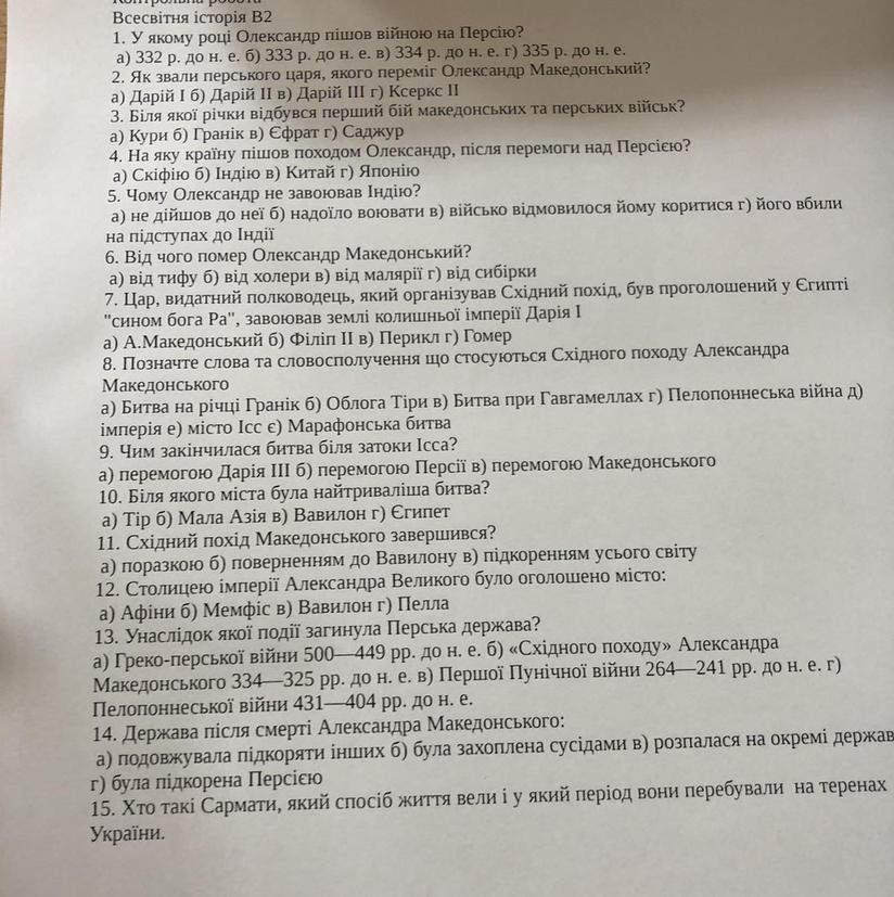 Ответ: 1) В 2) В 3) Б 4) Б 5) Б 6) В 7) А 8) а, б, в, д, е 9) В 10) Б 11) В 12) В 13) Б 14) В 15) кочовий іраномовний народ, який належав до іранської групи народів