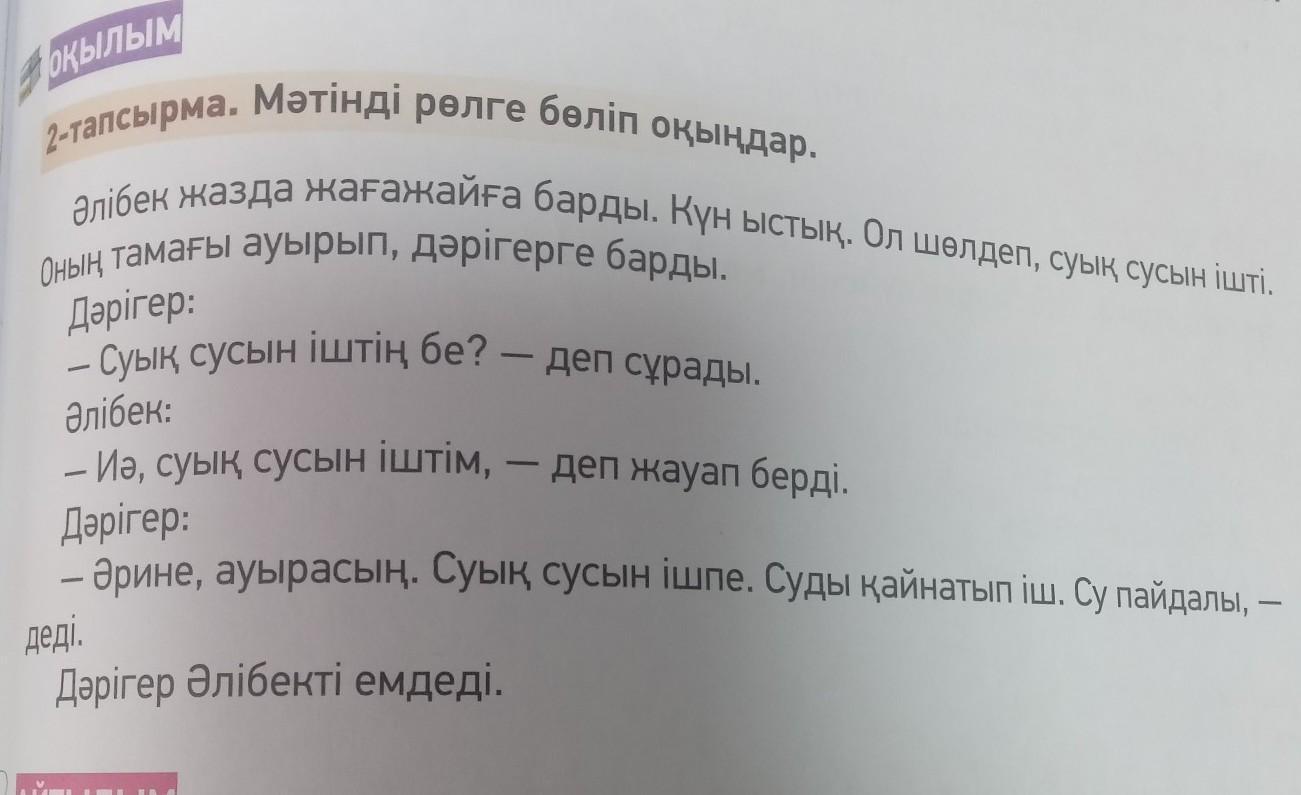 АЙТЫЛЫМ 6-тапсырма. Сұрақтарды пайдаланып, диалог құрыңдар. 1. Әлібек қайда барды? 2. Ол жағажайда не ішті? 3. Дәрігер қандай кеңес берді? СРОЧНО!!!!