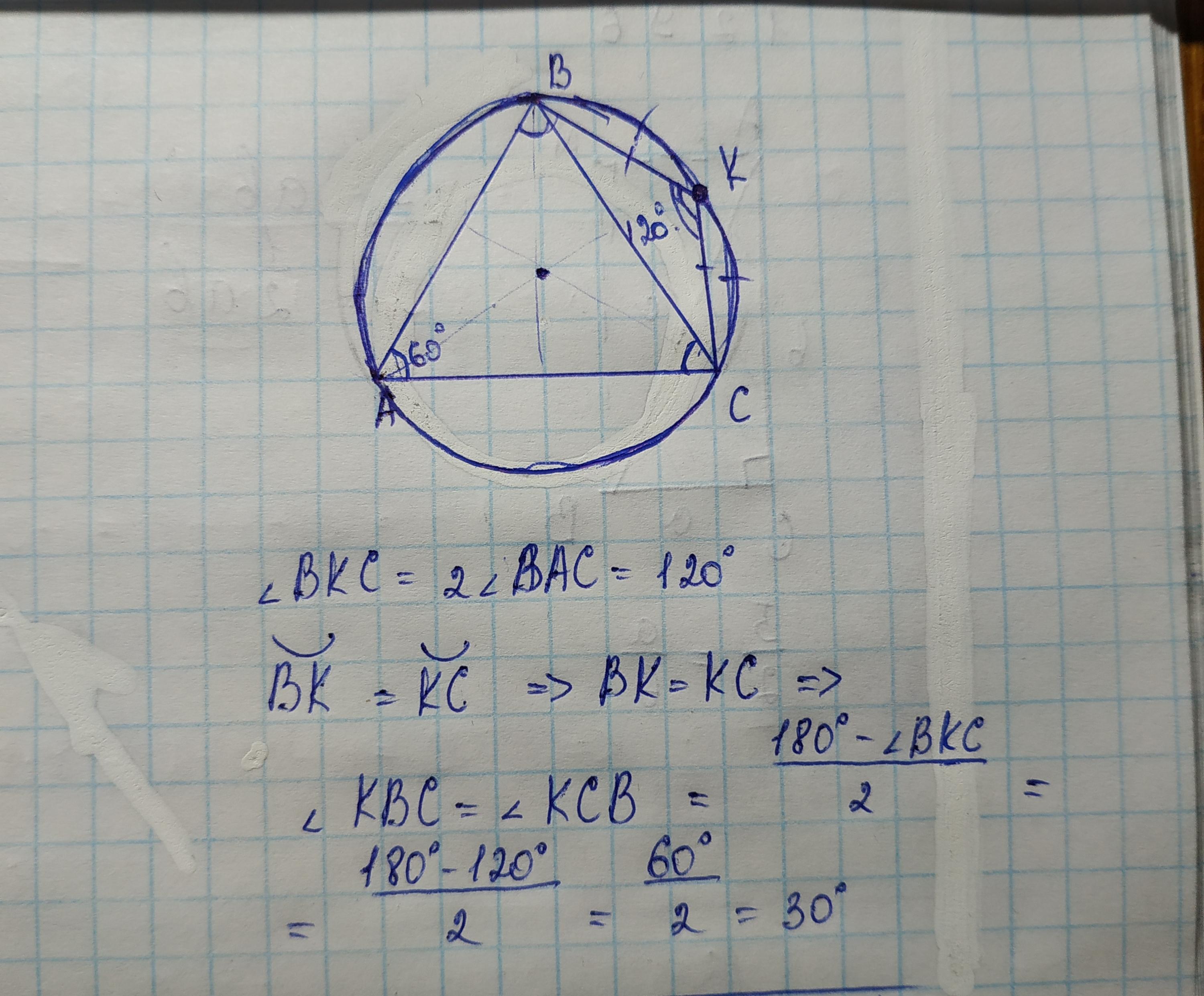 кут ACK = кут ACB + кут KCB =60°+30°=90°