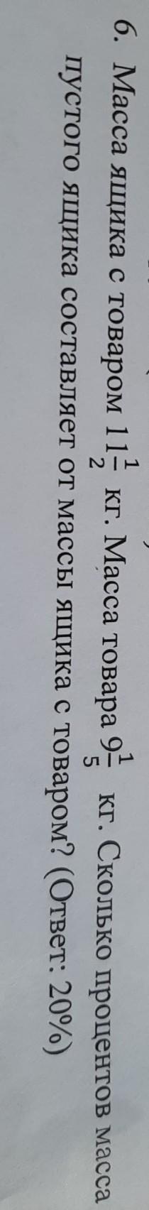 6. Масса ящика с товаром 11целых 1/10 кг. Масса товара 9 целых1/5 кг. Сколько процентов масса пустого ящика составляет от массы ящика с товаром? (Ответ: 20%) нужно еще условия: