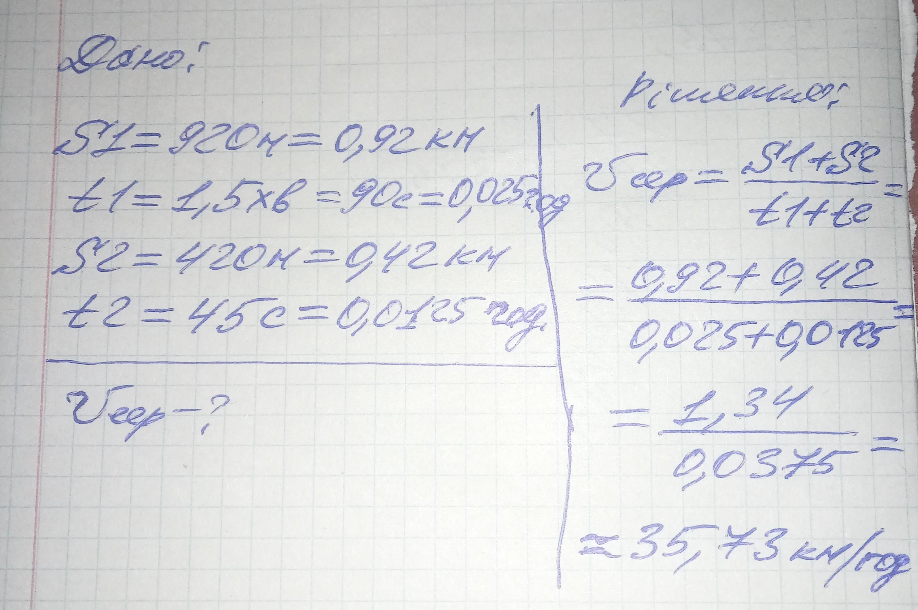Волисепелист проїхав 920 м за 1.5 хв а потім 420 м за 45 с знайдіть середню швидкіст. велосипидиста
