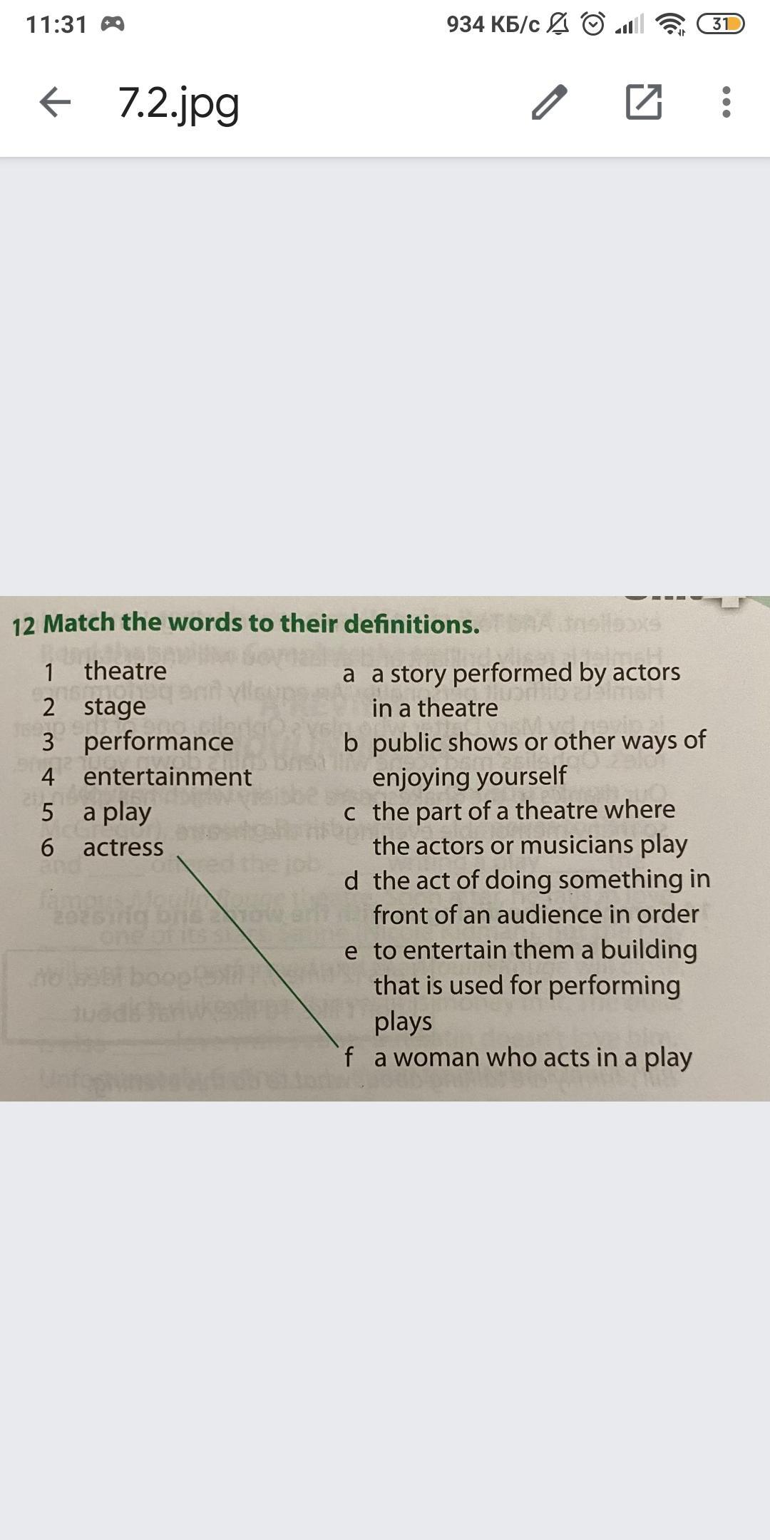 Match the words to their definitions. A mallows 1 theatre 2 stage 3 performance 4 entertainment 5 a play 6 actress a a story performed by actors in a theatre b public shows or other ways of enjoying yourself c the part of a theatre where the actors or musicians play d the act of doing something in front of an audience in order e to entertain them a building that is used for performing plays f a woman who acts in a play