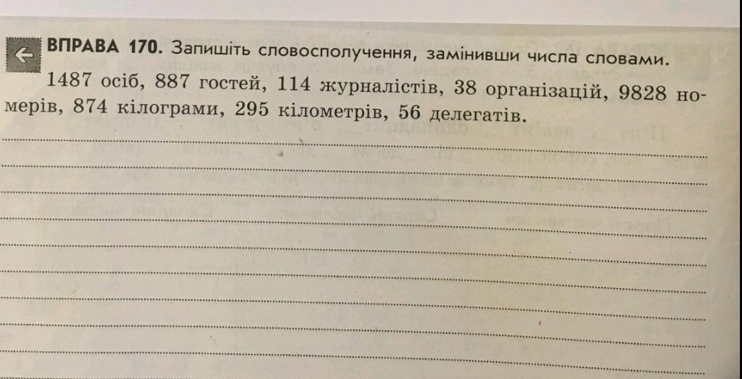 Ответ:тисяча чотириста вісімдесят сім осіб, вісімсот вісімдесят сім гостей, сто чотирнадцять журналістів, тридцять вісім організацій, дев'ять тисяч вісімсот двадцять вісім номерів, вісімсот сімдесят чотири кілограмів, двісті дев'яносто п'ять кілометрів, п'ятдесят шість делегатів. надіюсь я правильно зрозуміла завдання)