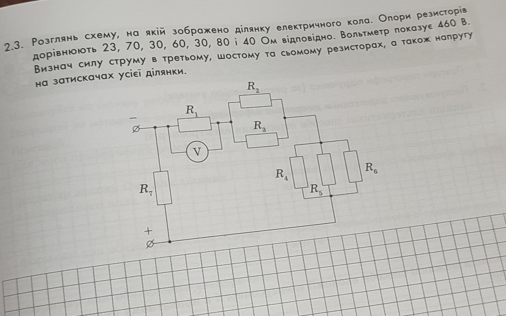 розглянь схему на якій зображено ділянку електричного кола. Опір резисторів дорівнюють 23 70 30 60 30 80 і 40 Ом відповідно. Вольтметр показує 460 В. Визнач силу струму в третьому шостому та сьомому резисторах а також напругу на затискачах усієї ділянки