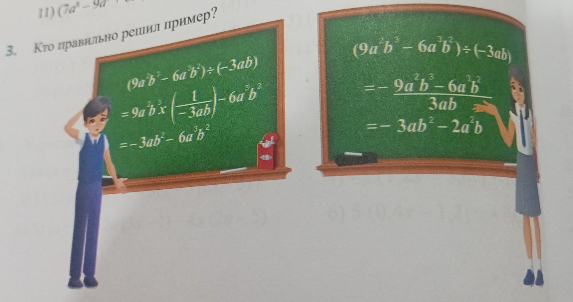 Девочка решила правильно, у мальчика во второй строчке непонятно откуда х взялось. Если он хотел поделить выражение почленно, то надо было и 9а²b³, и -6а³b² умножать на (- 1/3ab), а не что-то одно.