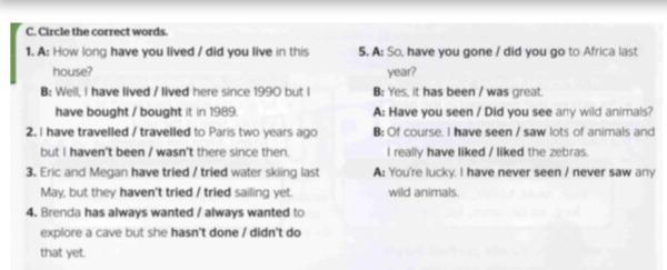 have lived, bought, travelled, haven't been there, have tried, haven't tried, always wanted, hasn't done, did you go, was, did you see, saw, liked, i have never seen