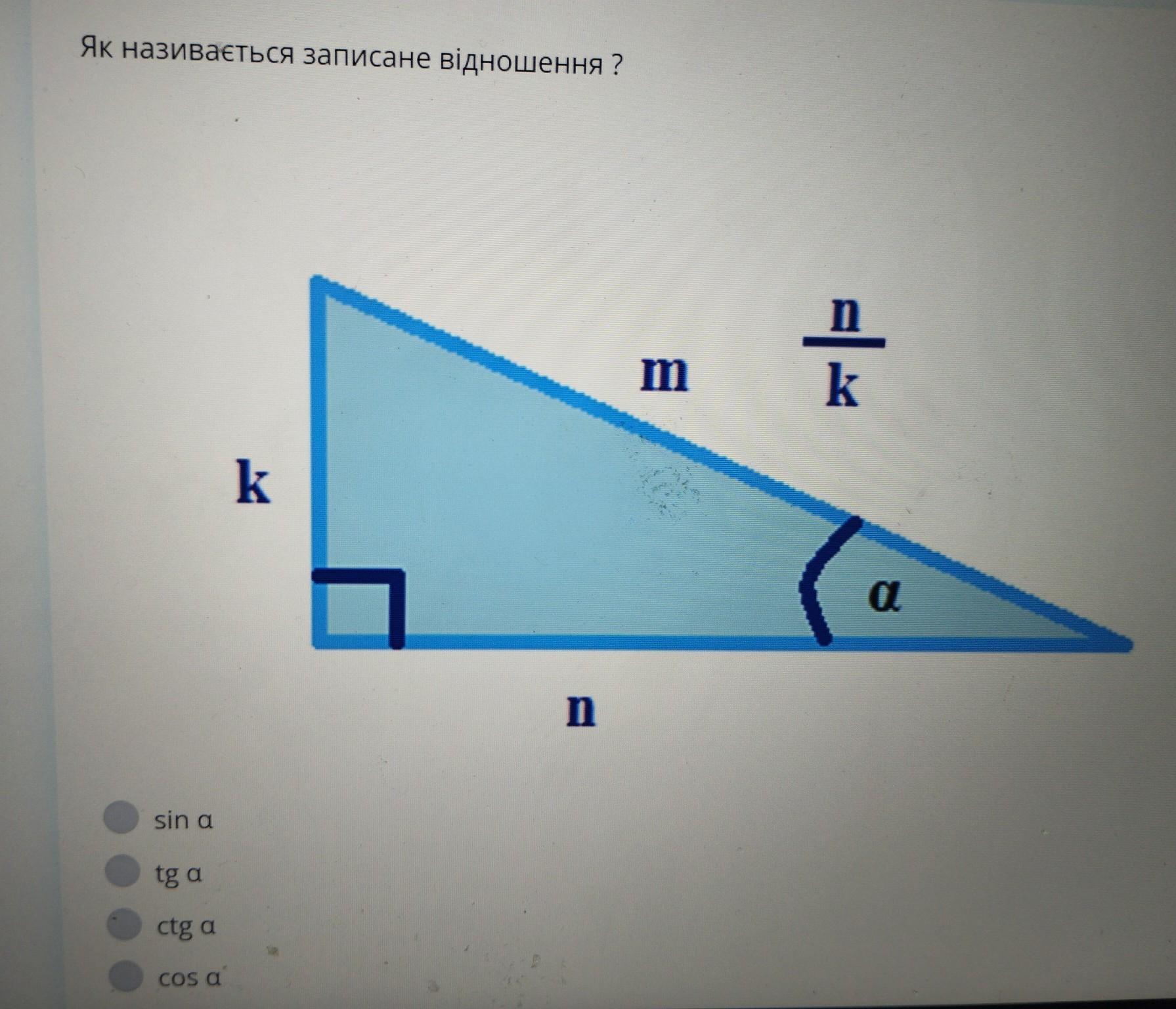 Котангенсом острого угла прямоугольного треугольника называется отношение прилежащего катета к противолежащему катету. Ответ: ctgA