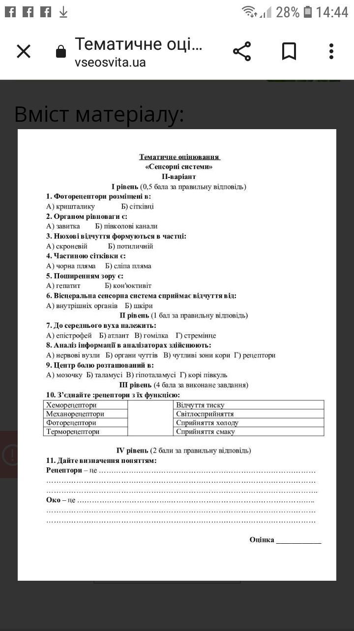 11. Рецептори є анатомічними структурами, які сприймають подразники. Око - парний має здатність сприймати електромагнітне довжин хвиль і забезпечує функцію зору.