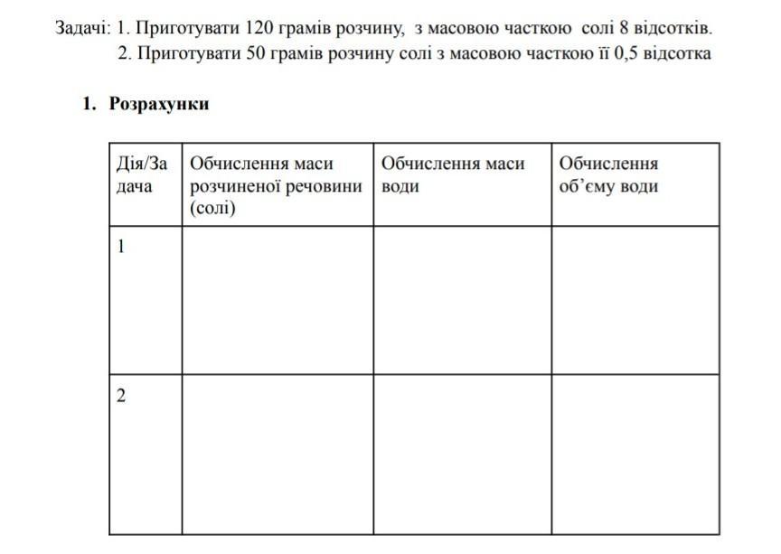 дааааю 100б!!!!!!!!!!!! срочноЗадачі: 1. Приготувати 120 грамів розчину, з масовою часткою солі 8 відсотків. 2. Приготувати 50 грамів розчину солі з масовою часткою її 0,5 відсотка