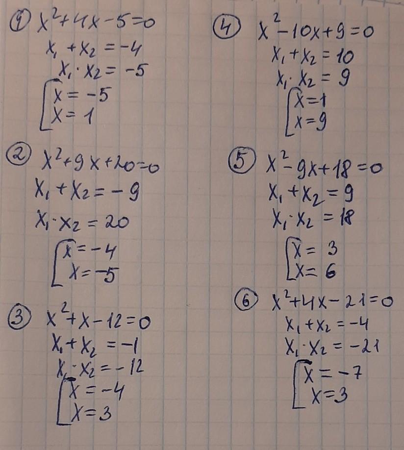 Розвʼязати рівняння за теоремою Вієта. 1) x^2+4x-5=0 2) x^2+9x+20=0 3) x^2+x-12=0 4) x^2-10x+9=0 5) x^2-9x+18=0 6) x^2+4x-21=0