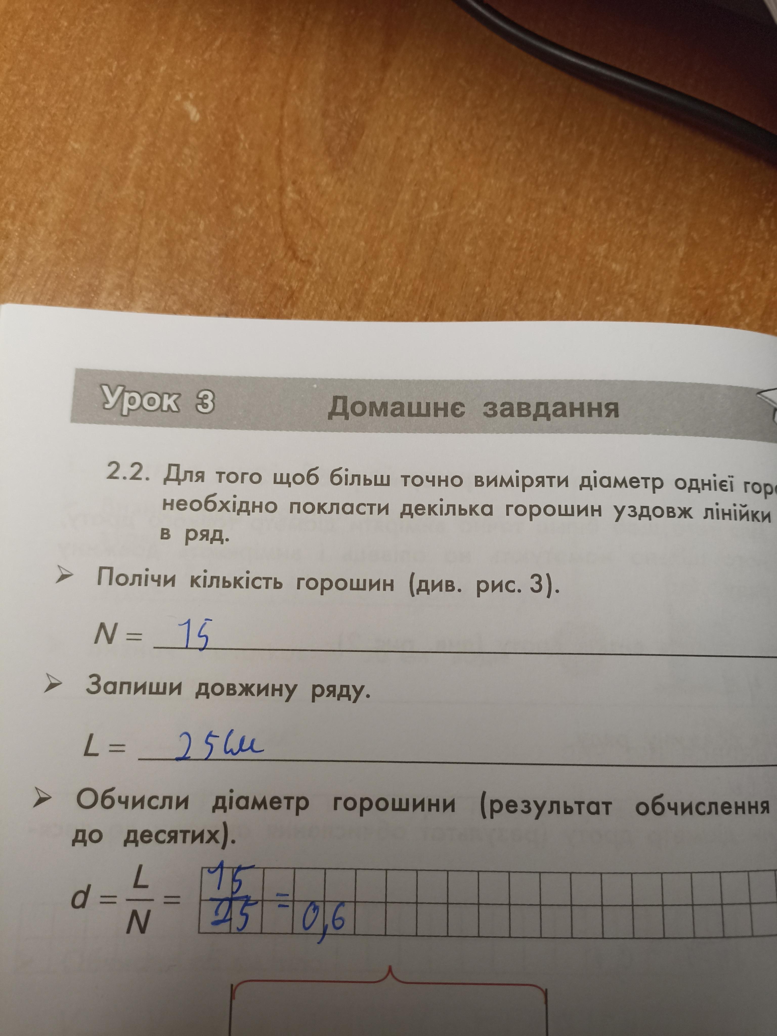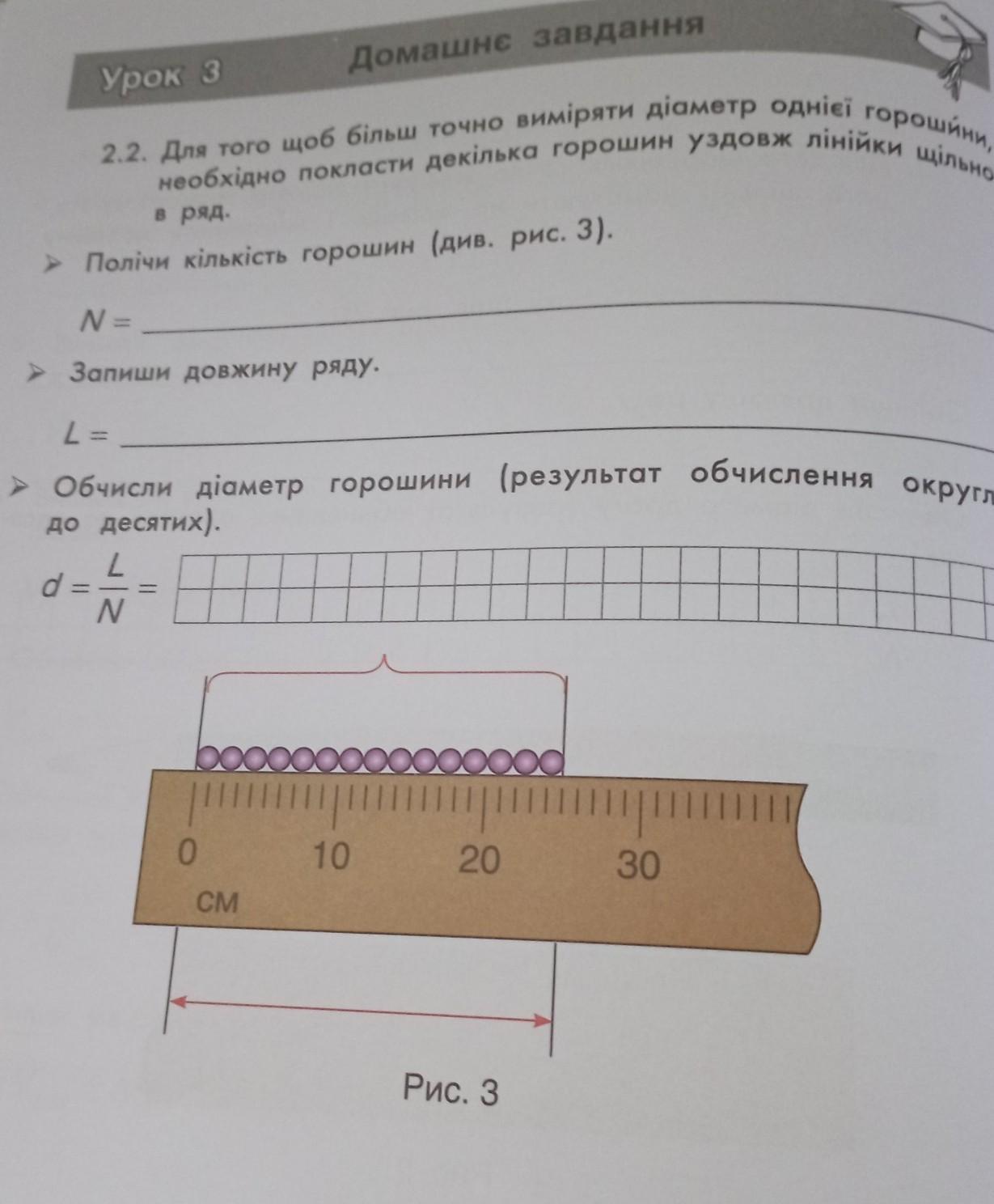 2.2. Для того щоб більш точно виміряти діаметр однієї горошини, необхідно покласти декілька горошин уздовж лінійки щільно в ряд. Полічи кількість горошин (див. рис. 3). N = Запиши довжину ряду. L= Обчисли діаметр горошини (результат обчислення округли до десятих). L d N pov STA 0 СМ 20 30 1