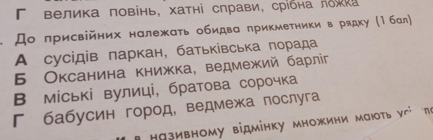 3. До присвійних належать обидва прикметники в рядку (1 бал) сусідів паркан, батьківська порада Оксанина книжка, ведмежий барліг міські вулиці, братова сорочка г бабусин город. ведмежа послуга