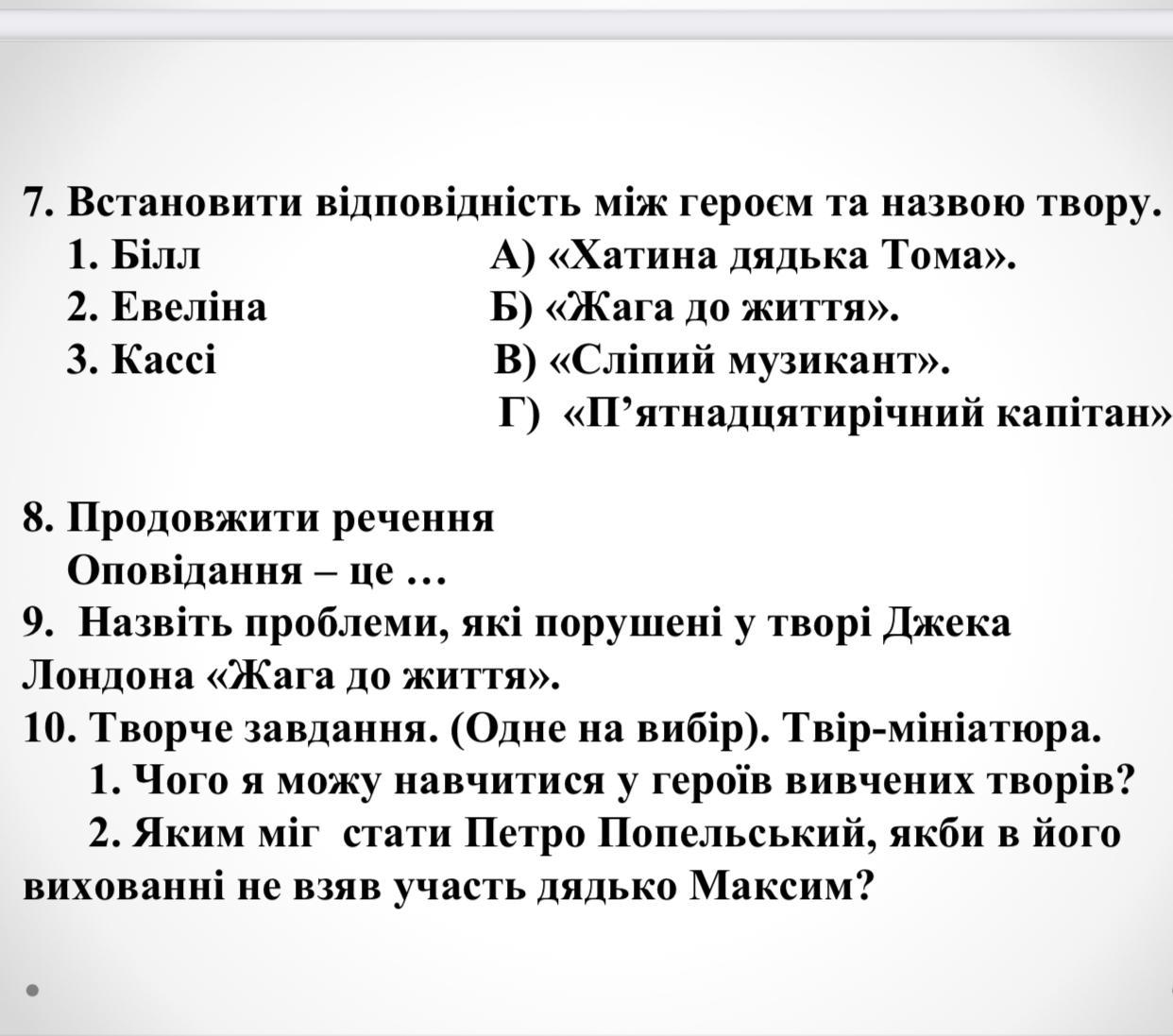 8. Оповіда́ння — невеликий за обсягом прозовий твір, у якому зображувалась одна подія з життя одного, або двох сформованих персонажів.