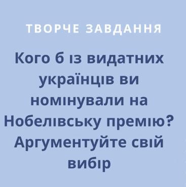 Я б номінував на Нобелівську премію Ліну Василівну Костенко. Ця видатна поетеса й письменниця входить до переліку найвідоміших жінок давньої та сучасної України.