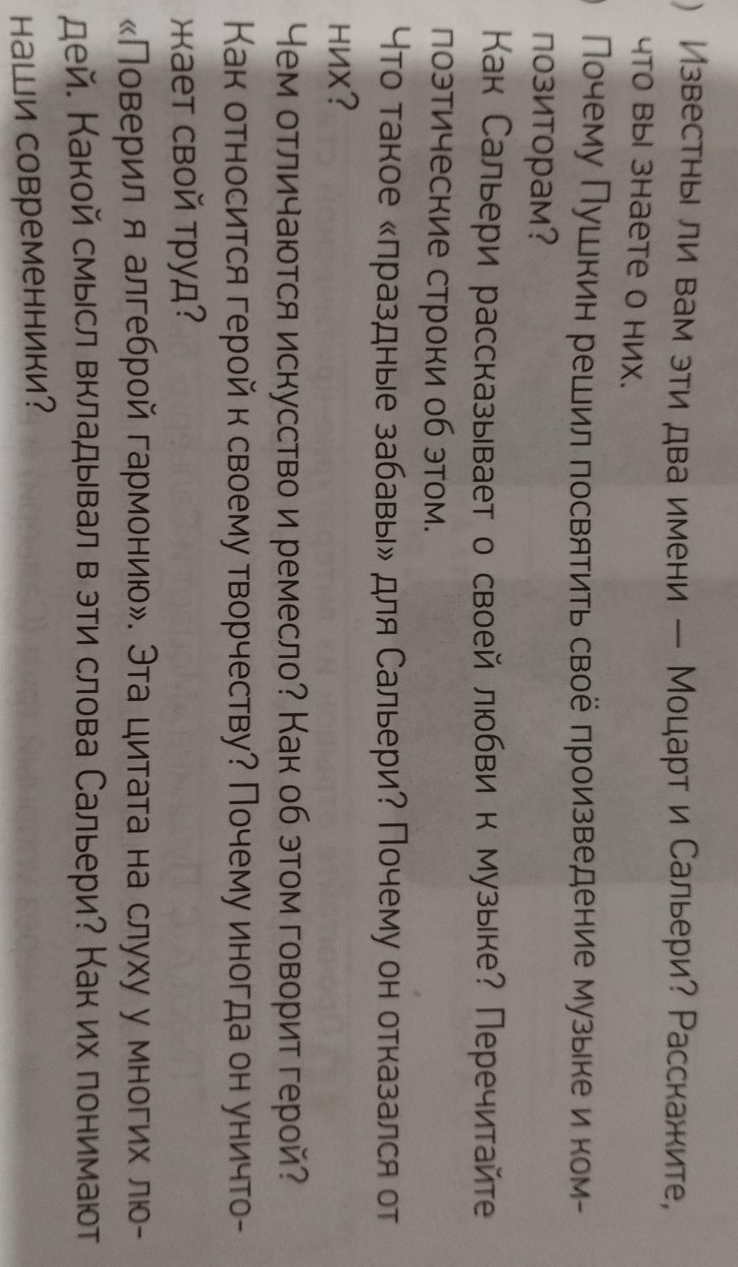 Анализируем художественный текст вместе. Ответьте на вопросы и вы- полните задания. 1) Известны ли вам эти два имени Моцарт и Сальери? Расскажите, что вы знаете о них. 2) Почему Пушкин решил посвятить своë произведение музыке и ком- позиторам? 3) Как Сальери рассказывает о своей любви к музыке? Перечитайте поэтические строки об этом. 4) Что такое «праздные забавы» для Сальери? Почему он отказался от них? - 5) Чем отличаются искусство и ремесло? Как об этом говорит герой? 6) Как относится герой к своему творчеству? Почему иногда он уничто- жает свой труд? «Поверил я алгеброй гармонию». Эта цитата на слуху у многих лю- дей. Какой смысл вкладывал в эти слова Сальери? Как их понимают наши современники?
