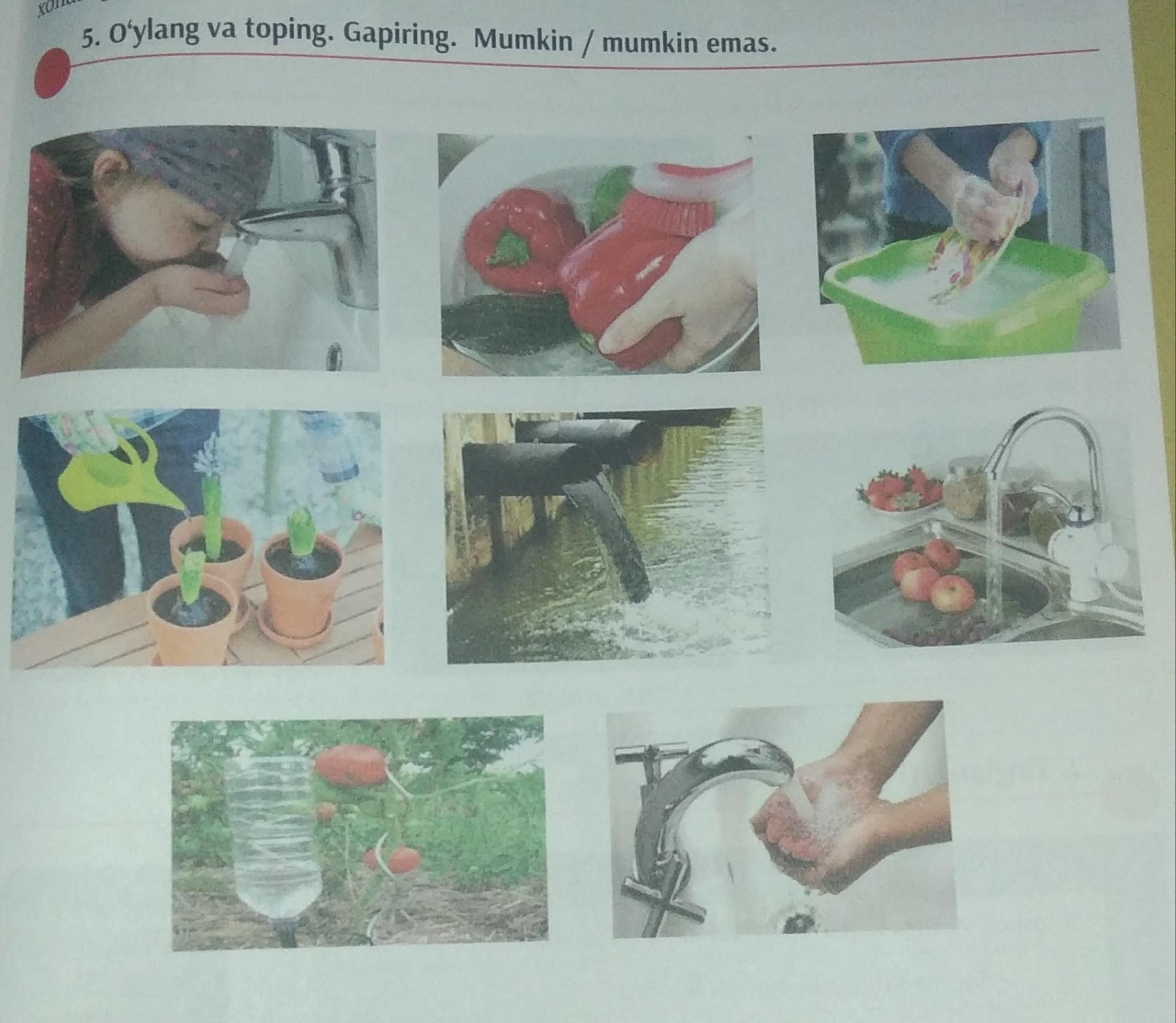1.Jo'mrakdan suv ichish mumkin emas,bu odobsizlik sanaladi.2.Sabzavotlarni maxsus cho'tkada yuvish mumkin,bu soĝliq garovi.3.Toĝorachada idisharni yuvish mumkin,bunda suv tejaladi.4.Gullarga maxsus suĝorgich idishda suvquyish mumkin,bunda suv sachrab isrof bo'lmaydi.5.Chiqindi suvlarni toza suvlarga quyish mumkin emas,bunda tabiat va insoniyat aziyat chekadi.6.Rokvennada suvni oqizib mevalarni yuvish mumkin emas,bunda suv ortiqcha isrof bo'ladi.7.Sabzavotlarni tomchilab suĝorish mumkin,bunda ham suv tejaladi.8.Qo'llarni yuvishda meyyorda suvni ochib so'ngra yuvish kerak.