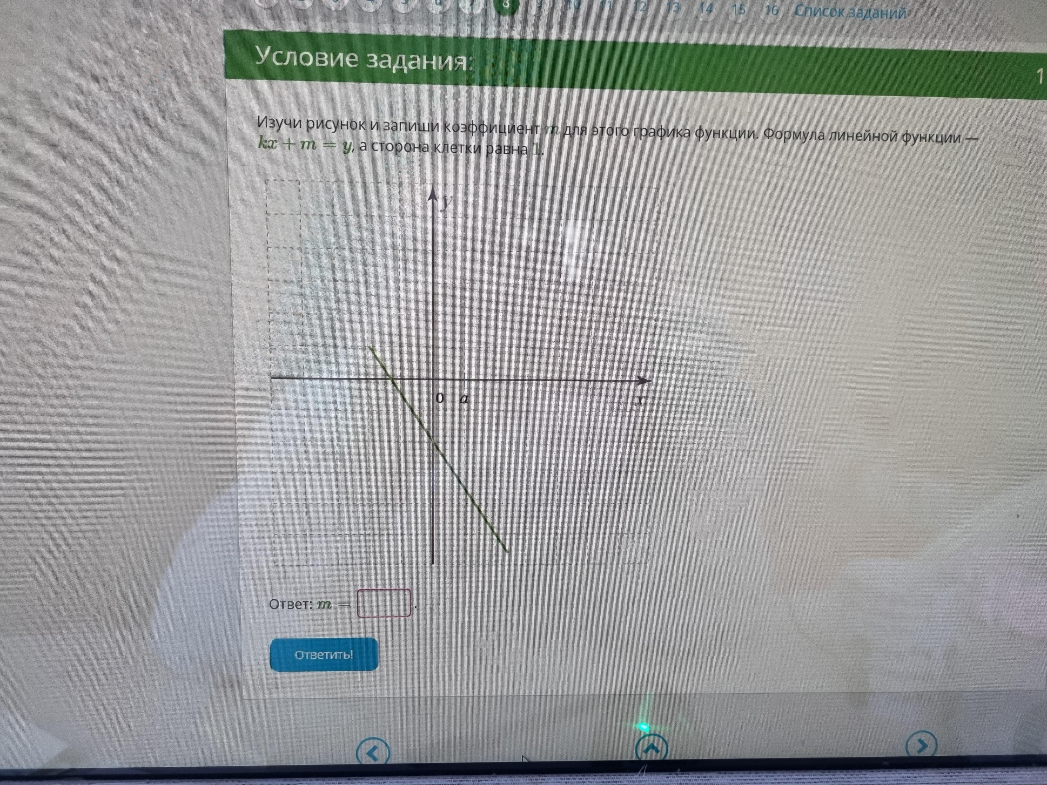 Изучи рисунок и запиши коэффициент m для этого графика функции. Формула линейной функции kx+m=y, а сторона этой клетки равна 1 .