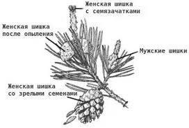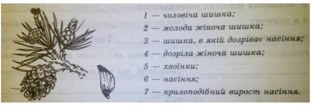 1- 2 3 4 1 чоловiча шишка; XNP молода жіноча шишка; шишка, в якій дозріває насіння, дозріла жіноча шишка; 5 - хвоїнки; насiння; 6 7 - крилоподібний вирост насіння. -