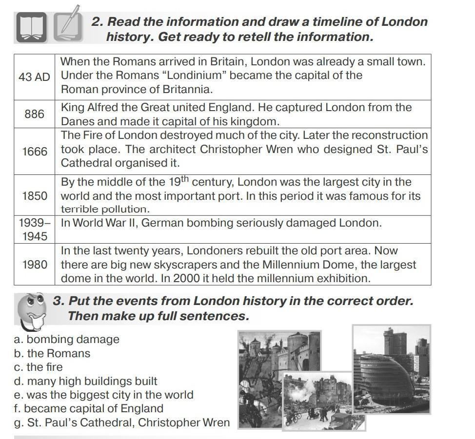ПОМОГИТЕ ПОЖАЛУЙСТА ‼️ 3. Put the events from London history in the correct order. Then make up full sentences. a. bombing damage b. the Romans c. the fire d. many high buildings built e. was the biggest city in the world f. became capital of England g. St. Paul's Cathedral, Christopher Wren