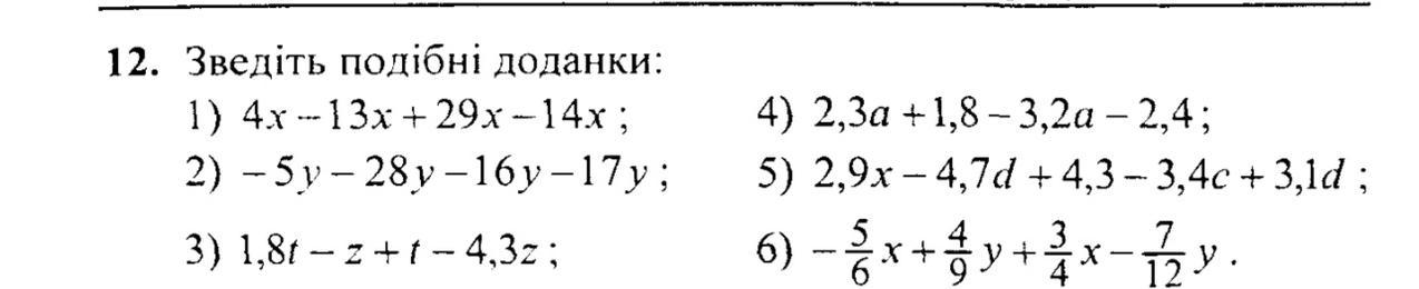 Ответ: 1) 6х; 2) -66у; 3) 2,8t - 5,3z; 4) -0,9a - 0,6; 5) 2,9x - 1,6d + 4,3 - 3,4c; 6) -1/12x - 5/36y