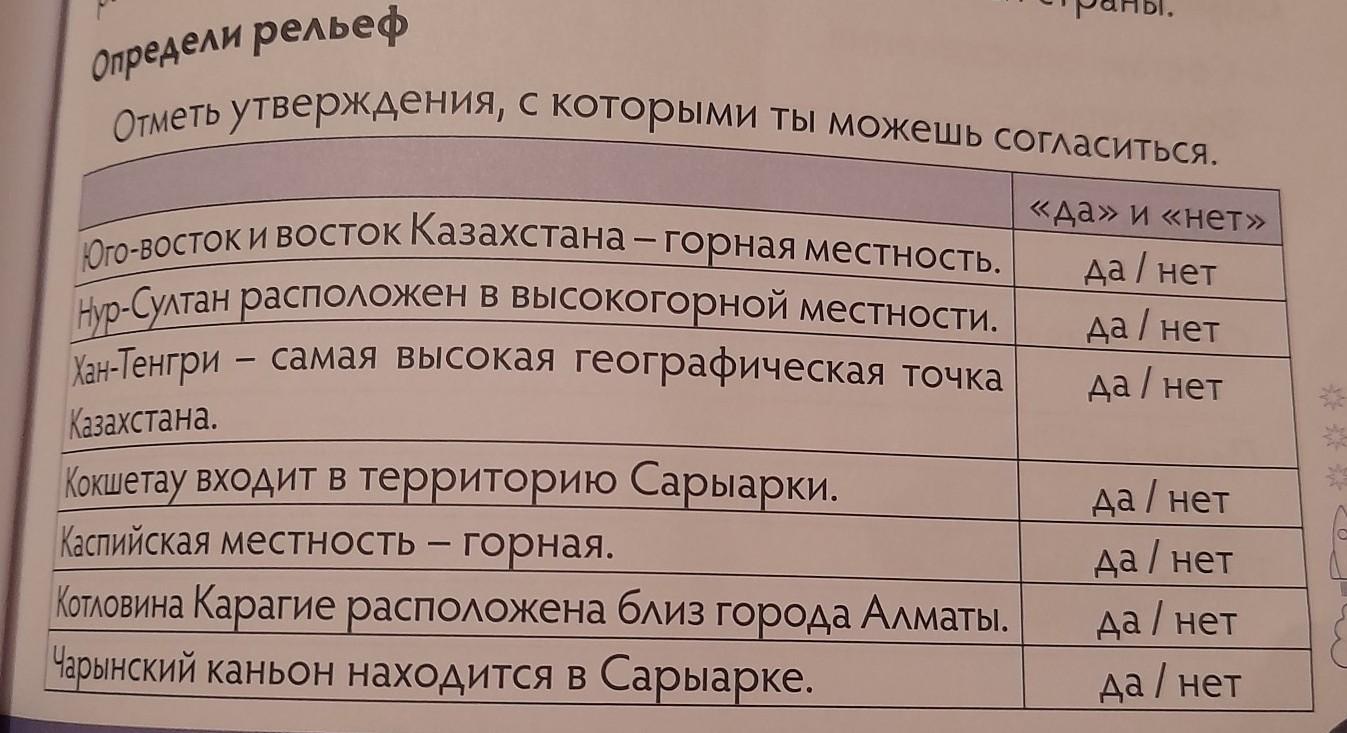 Определи рельеф Отметь утверждения, с которыми ты можешь согласиться. Юго-восток и восток Казахстана - горная местность. Нур-Султан расположен в высокогорной местности. Хан-Тенгри - самая высокая географическая точка Казахстана. Кокшетау входит в территорию Сарыарки. Каспийская местность - горная. - Котловина Карагие расположена близ города Алматы. Чарынский каньон находится в Сарыарке. > и «нет» да /нет да/нет да / нет /нет да да /нет да / нет да /нет же жена од со ПЖППЖПЖПЖПЖ ДАМ 40 БАЛЛОВ