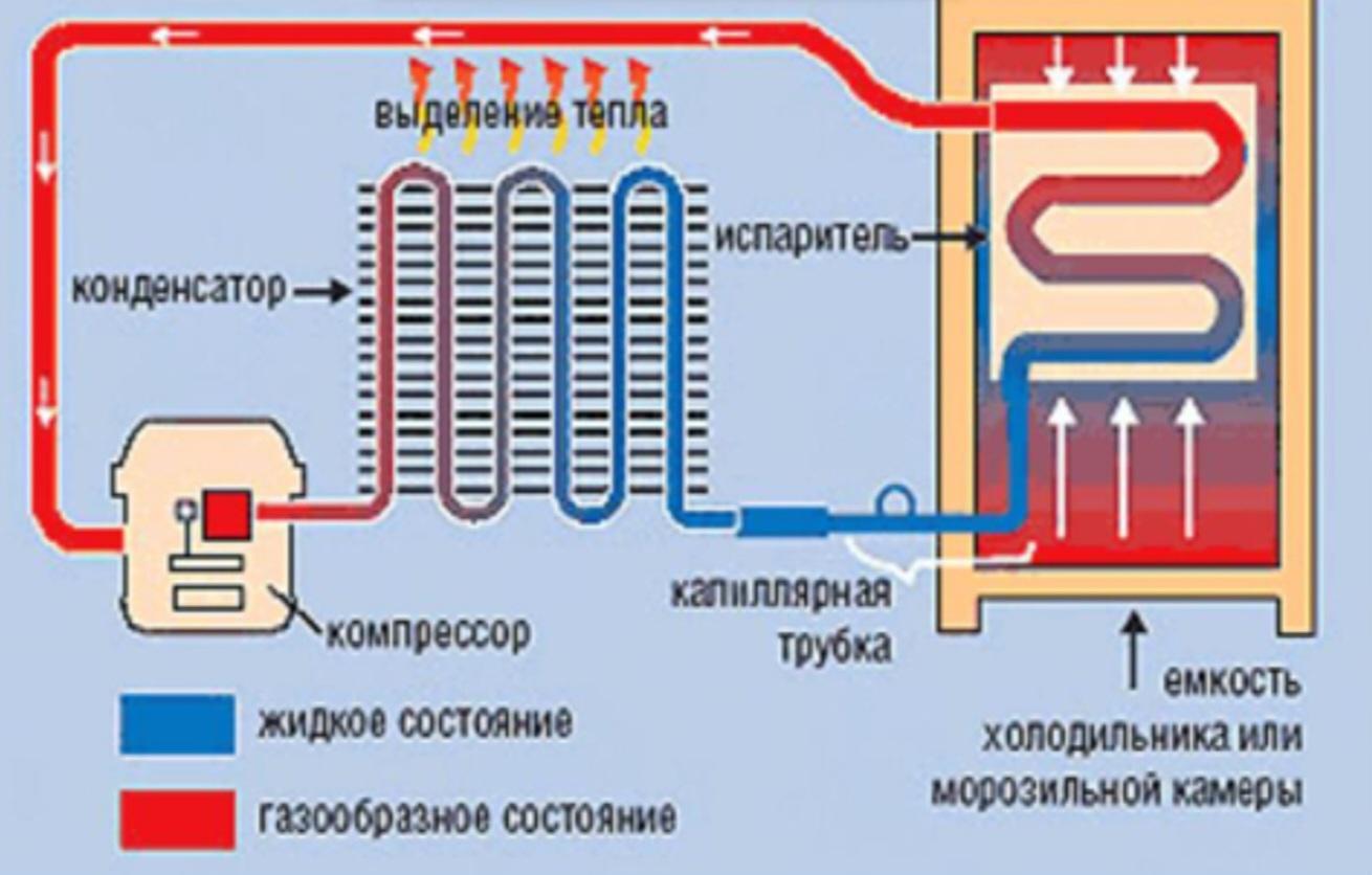 Принцип работы холодильника основан на отборе тепла в процессе кипения фреона и отдаче энергии окружающей среде. Компрессор нагнетает давление, вызывая принудительную циркуляцию хладагента. Это вещество испаряется в испарителе, поглощая тепло из воздуха камеры.