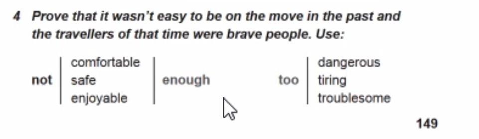 С. 149 впр. 4-написати твір на 6 речень про подорожі в минулому(довести, що це було нелегко), звернути увагу на слова enough, too та їх місце в реченні