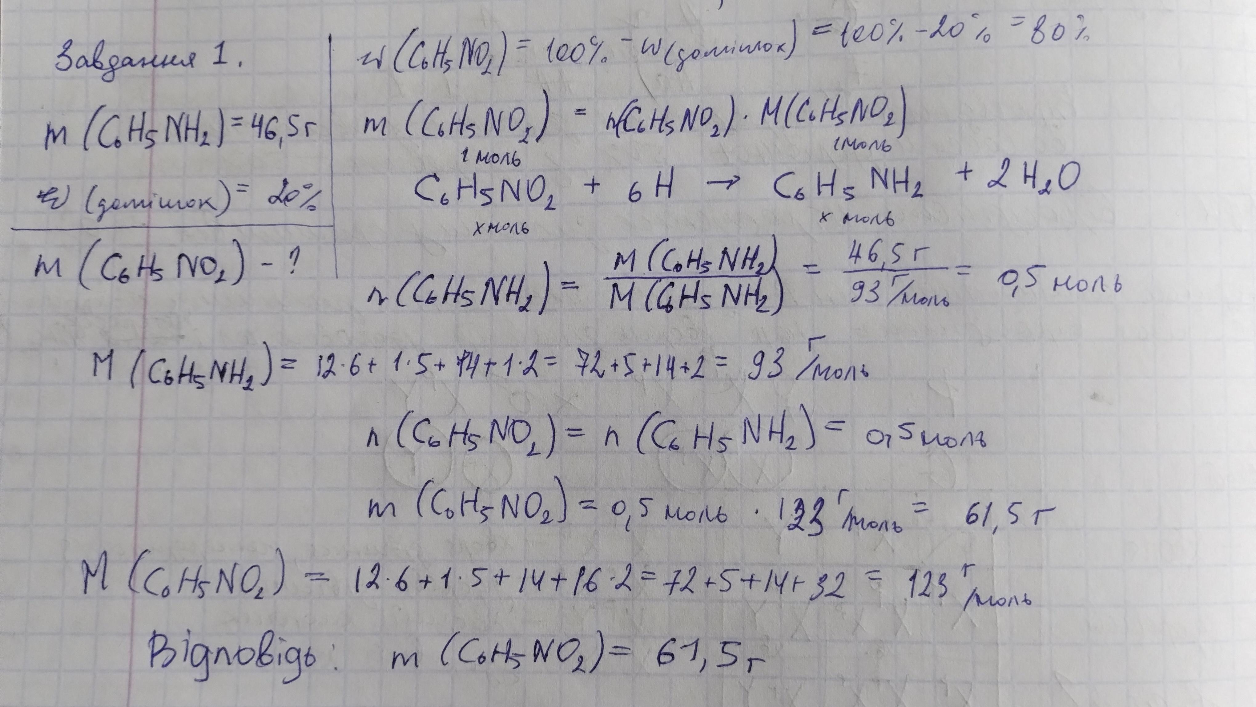 Основний спосіб добування аніліну — відновлення нітробензену. Яку масу технічного нітробензену потрібно взяти для добування аніліну масою 46,5 г, якщо масова частка домішок у нітробензені складає 20%.