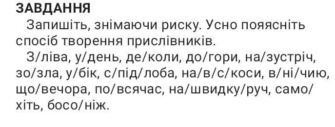 Зліва, у день, деколи, догори, на зустріч, зозла, у бік, спідлоба, навскоси, внічию, щовечора, нашвидкуруч, самохіть, босоніж