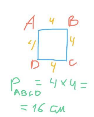 У квадрата всі сторони рівні, тому, щоб знайти його периметр треба або додати всі його сторони, тобто: 4+4+4+4=16см, або 4*4=16см.
