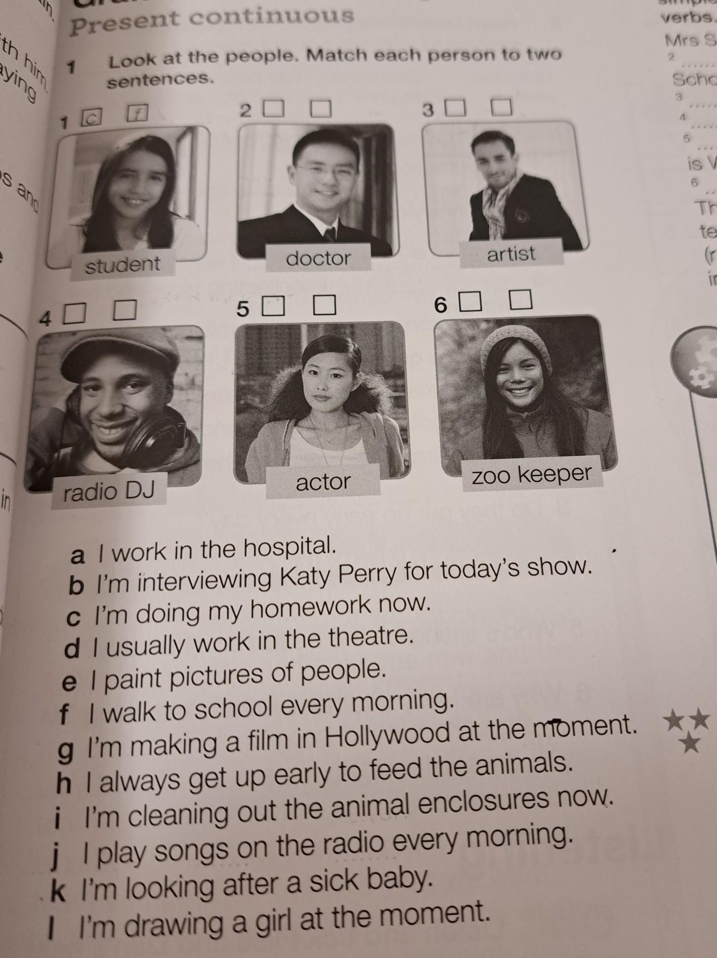 again. aying os and 2 Grammar Present simple and Present continuous Look at the people. Match each person to two sentences. 1 1 student radio DJ 2 5 doctor actor 3 60 artist ** 3 zoo keeper a I work in the hospital. b I'm interviewing Katy Perry for today's show. c I'm doing my homework now. d I usually work in the theatre. e I paint pictures of people. f I walk to school every morning. g I'm making a film in Hollywood at the moment. h I always get up early to feed the animals. i I'm cleaning out the animal enclosures now. j I play songs on the radio every morning. k I'm looking after a sick baby. I I'm drawing a girl at the moment.