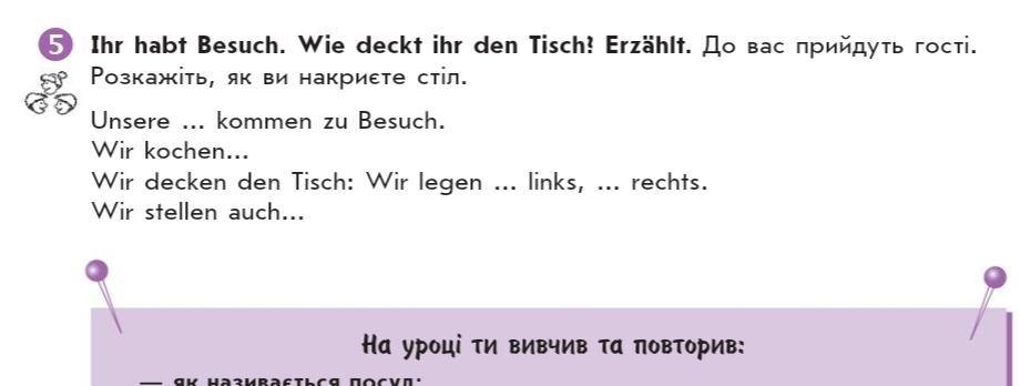 Ответ: 1. Freunde 2. Hühnchen 3. Gabel, messer 4. Gläser