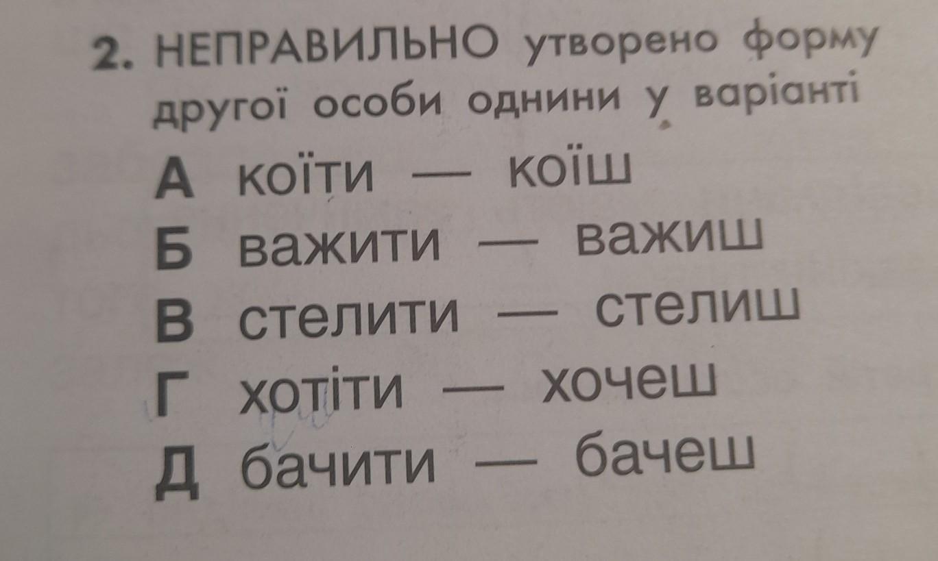 2. НЕПРАВИЛЬНО утворено форму другої особи однини у варіанті А коїти - коїш Б В Г Д важиТИ - важиш стелиТИ стелиш хотіти - хочеш бачити бачеш