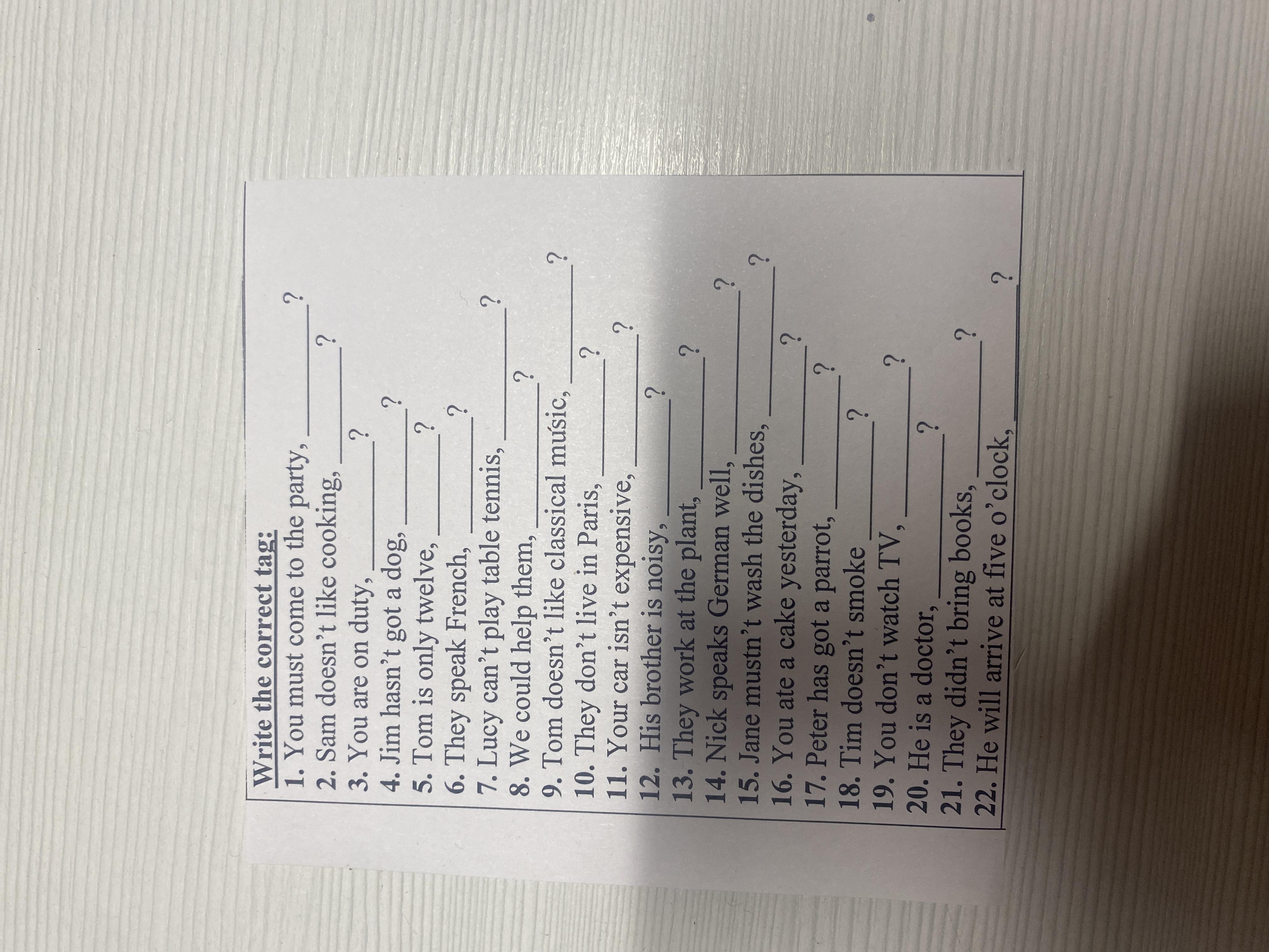 1).....mustn't you 2)... does he. 3)....aren't you 4)....has he 5)......isn't he 6) don't they 7)can she 8) couldn't he 9) does he 10)do they 11)is it 12) isn't he 13) don't they 14) doesn't he 15)must she 16) didn't you 17) hasn't he 18) does he 19)do you 20) isn't he 21) did they