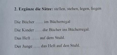 2. Ergänze die Sätze: stellen, stehen, legen, liegen Die Bücher....... im Bücherregal Die Kinder ...... die Bücher ins Bücherregal. Das Heft auf dem Stuhl. Der Junge...... das Heft auf den Stuhl. *******