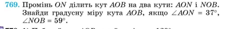 769. Промінь ON ділить кут АОВ на два кути: AON i NOB. Знайди градусну міру кута АОВ, якщо ZAON = 37°, ZNOB = 59°.