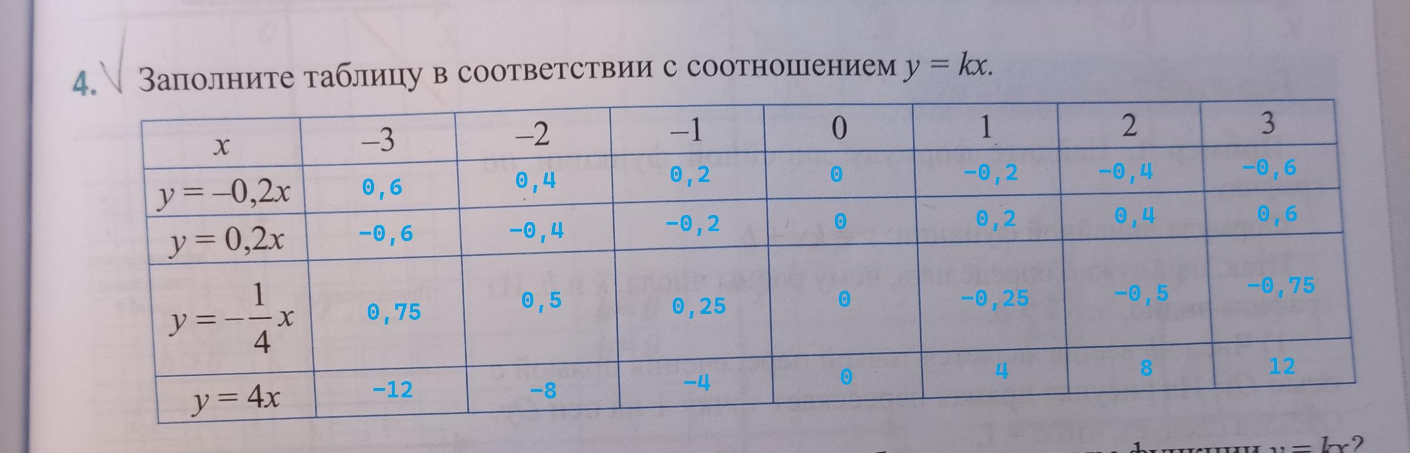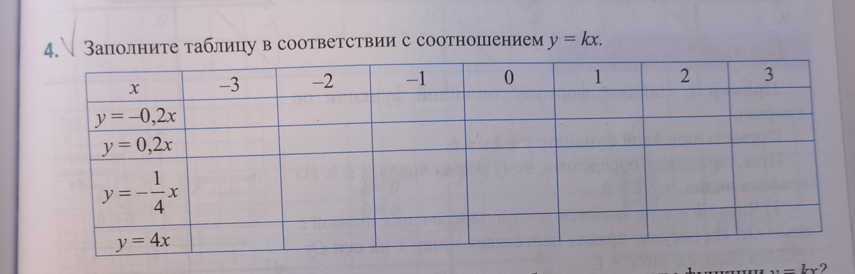 4. Заполните таблицу в соответствии с соотношением y = kx.