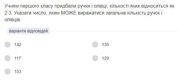 Учням першого класу придбали ручки і олівці, кількості яких відноситься як 2:3. Указати число, яким МОЖЕ виражатися за- гальна кількість ручок і олівців.