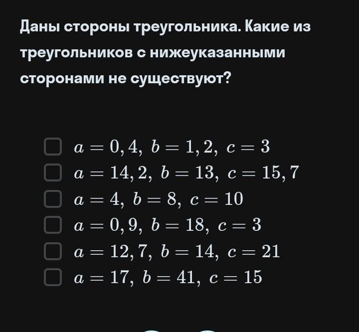 Решение : Каждая сторона треугольника должна быть меньше суммы двух других сторон.