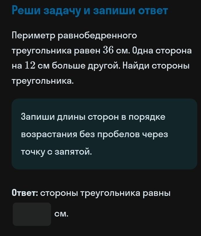 Периметр равнобедренного треугольника равен 36 см. Одна сторона на 12 см больше другой. Найди стороны треугольника. Запиши длины сторон в порядке возрастания без пробелов через точку с запятой. Ответ: стороны треугольника равны CM.