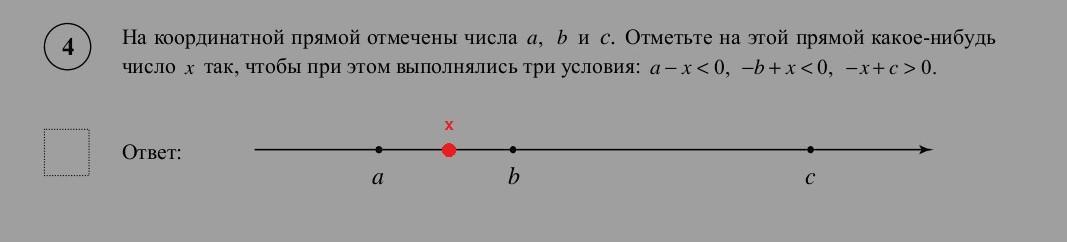 4. На координатной прямой отмечены числа а, b и с. Отметьте на этой прямой какое-нибудь число х так, чтобы при этом выполнялись три условия: а - х < 0, -b + x < 0, -x + c > 0.