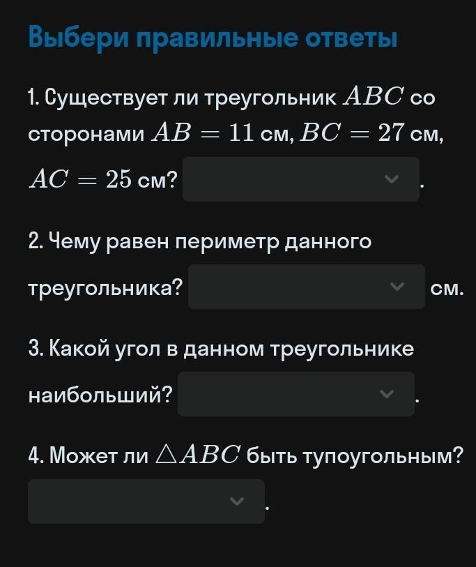 Выбери правильные ответы 1. Существует ли треугольник АВС со сторонами AB = 11 см, ВС = 27 см, AC = 25 см? = 2. Чему равен периметр данного треугольника? 3. Какой угол в данном треугольнике наибольший? CM. 4. Может ли ДАВС быть тупоугольным?