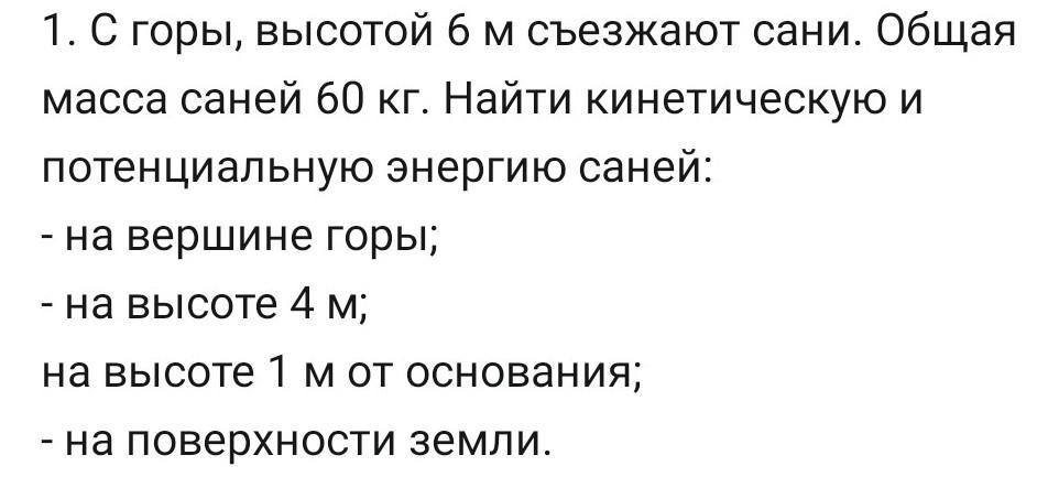 1. С горы, высотой 6 м съезжают сани. Общая масса саней 60 кг. Найти кинетическую и потенциальную энергию саней: - на вершине горы; - на высоте 4 м; на высоте 1 м от основания; - на поверхности земли.
