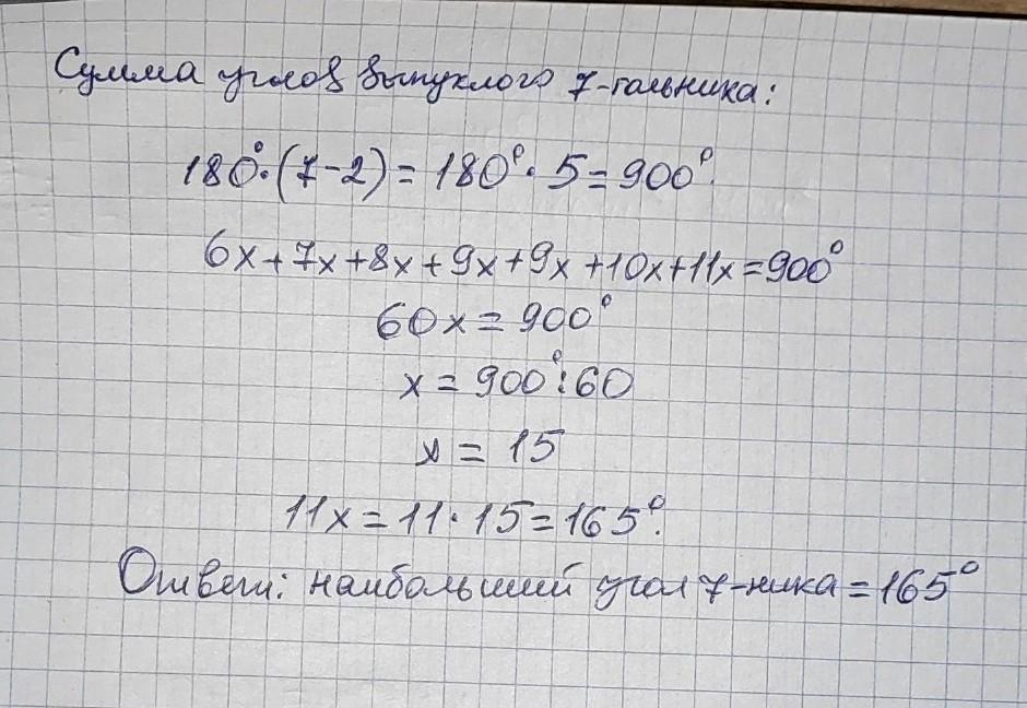 Знайдіть найбільший кут опуклого семикутника, якщо його кути відносяться як 6:7:8:9:9:10:11