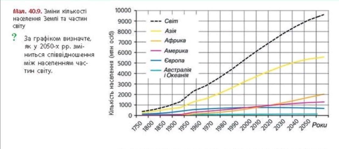 за графіком визначити , як у 2050 році зміниться співвідношення між населенням частин світу