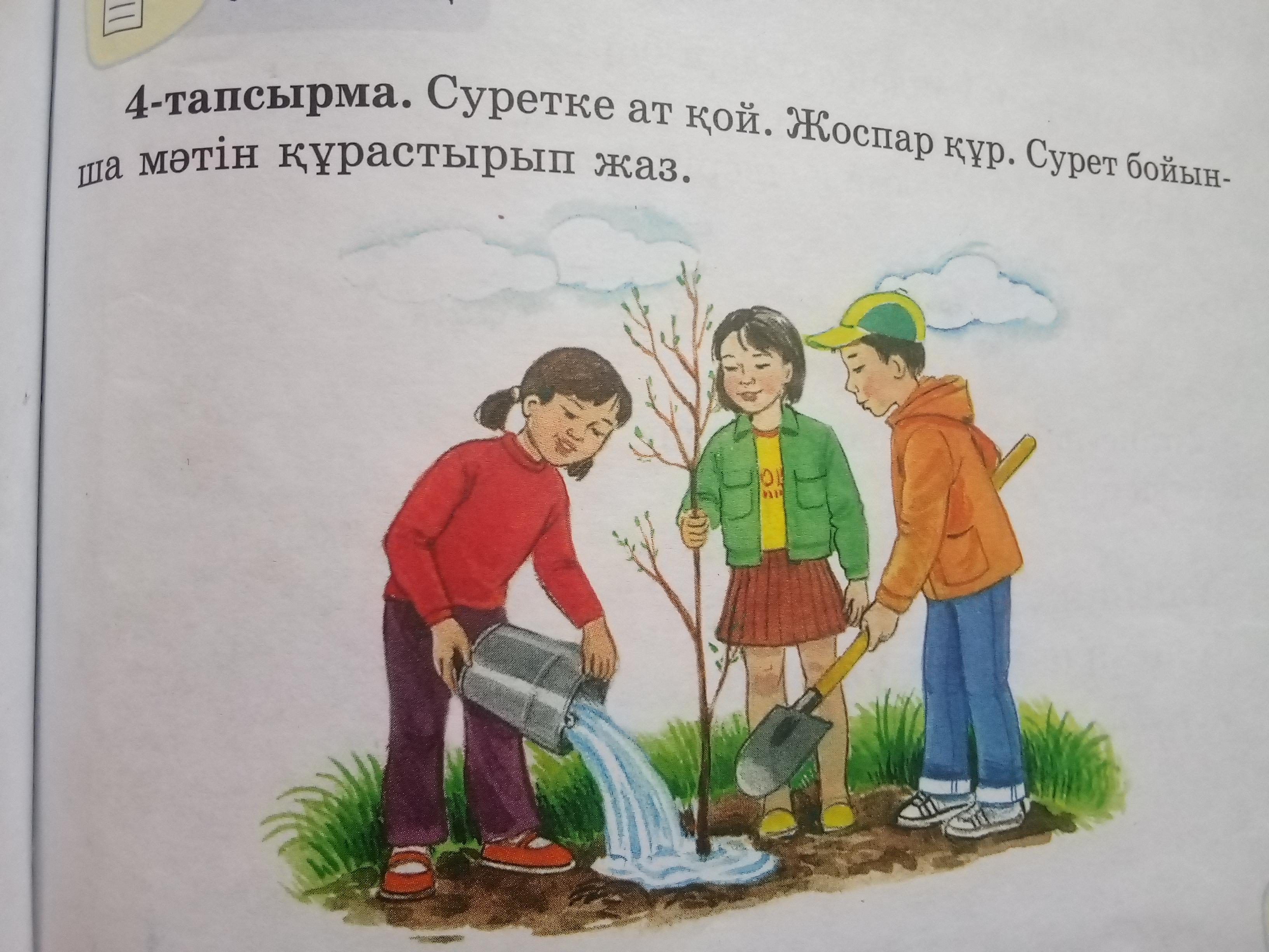 Мәтін:Мен бүгін өз достарыммен аулада ағаш отырғызайық деп шештік.Достарым туралы айта кетсек Әлия мен Айша.Біз жерді қазып бәрін дайындап алдық.Бұтақты отырғызып,су құйып,топырақпен жақсылап көміп қойдық.Сосын үйге барып сол жасаған жақсы ісімізді ата-аналарымызға айттық, олар бізді мақтады.