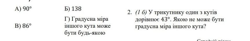 2. у трикутнику один з кутів дорівнює 43°. Якою не може бути градусна міра іншого кута?