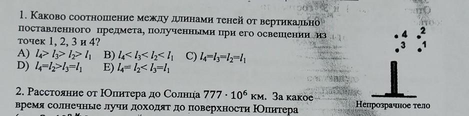 1. Каково соотношение между длинами теней от вертикально поставленного предмета, полученными при его освещении из точек 1, 2, 3 и 4?